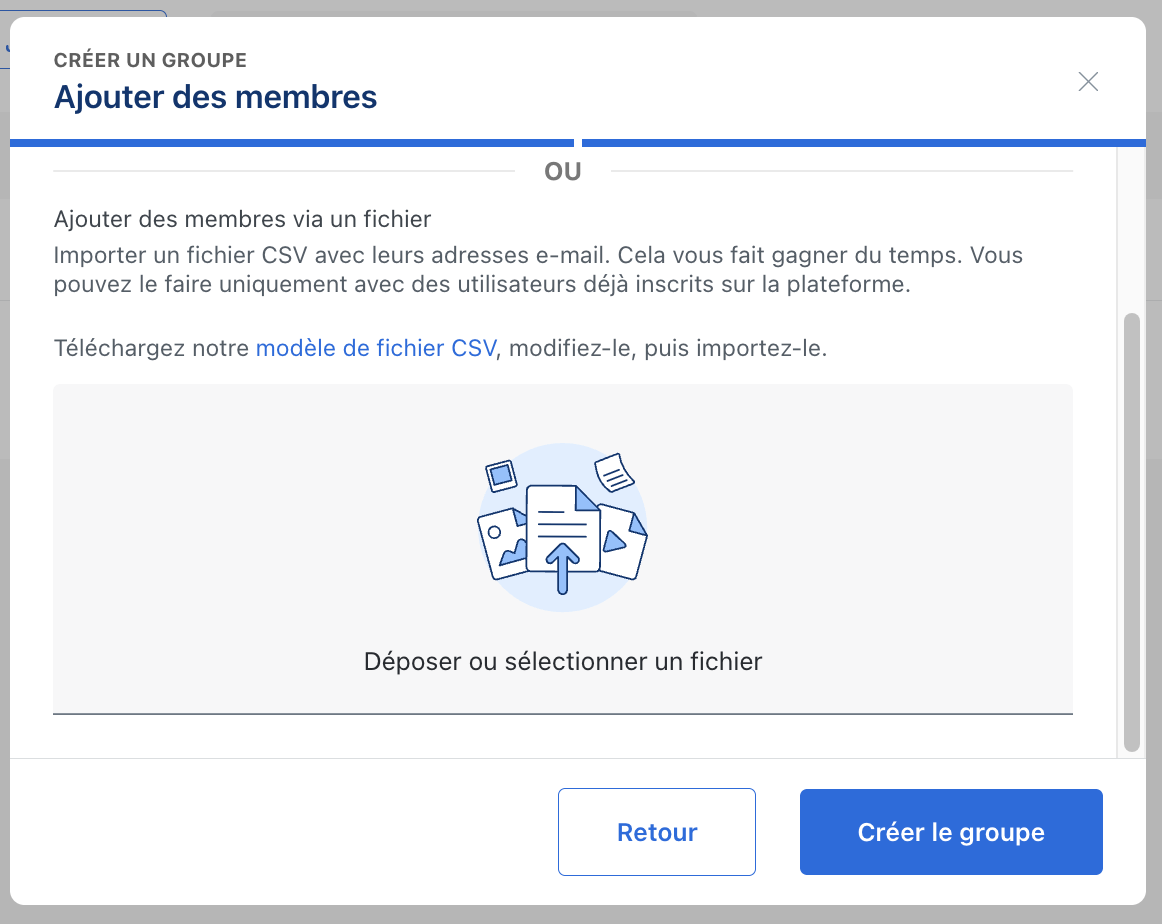Il est de même possible d'importer une liste des utilisateurs déjà inscrits sur la plateforme via un fichier. Téléchargez notre modèle de fichier CSV vierge en cliquant sur le texte correspondant, et modifiez-le en ajoutant les adresses emails des utilisateurs concernés. Téléversez ensuite votre fichier CSV en cliquant sur Déposer ou sélectionner un fichier ou en faisant un glisser-déposer.