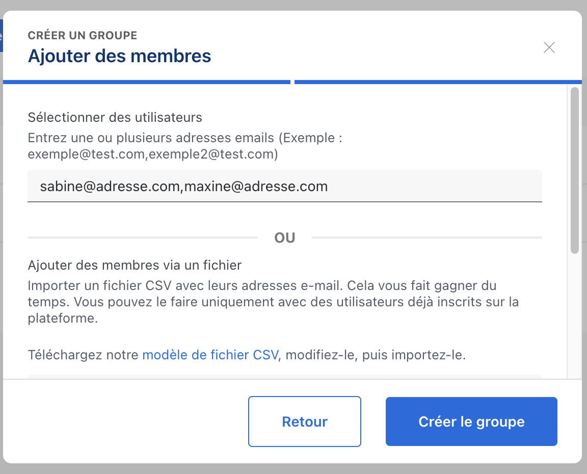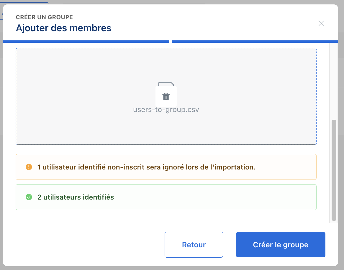 Si vos utilisateurs sont déjà inscrits sur la plateforme, la modale vous indiquera le nombre d'utilisateurs prêts à être ajoutés dans le groupe. Si vous avez ajouté dans votre fichier les adresses d'utilisateurs qui ne sont pas inscrits sur la plateforme, la modale vous indiquera le nombre d'utilisateurs qui ne seront pas pris en compte lors de l'import.