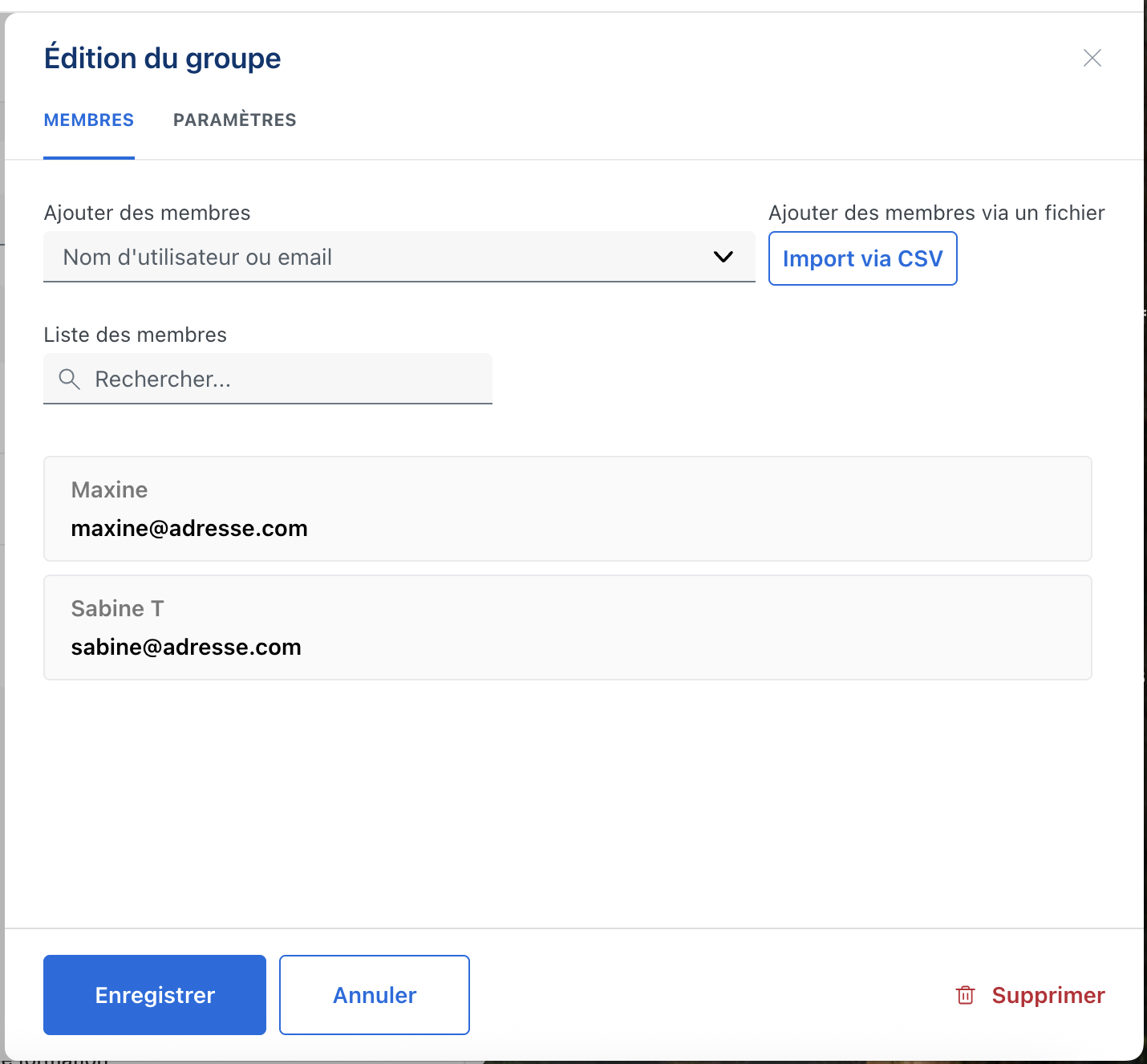 Vous pouvez ajouter de nouveaux membres en passant par un import via CSV (comme décrit ci-dessus) ou manuellement, en faisant une recherche par nom d'utilisateur ou par adresse mail.
