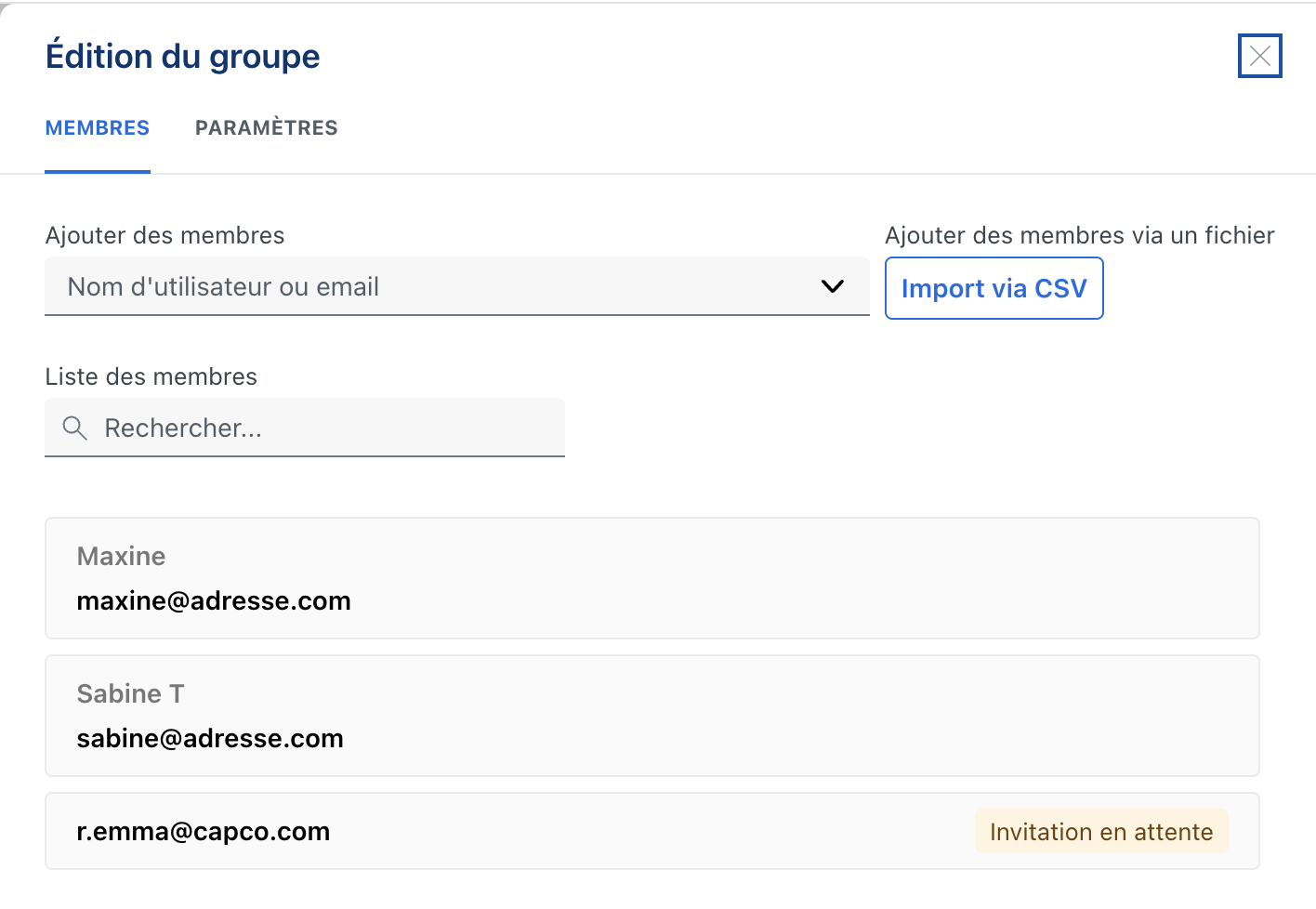 Vous pouvez ajouter le ou les membres en les ajoutant manuellement, en entrant leur adresse mail dans le champ dédié.