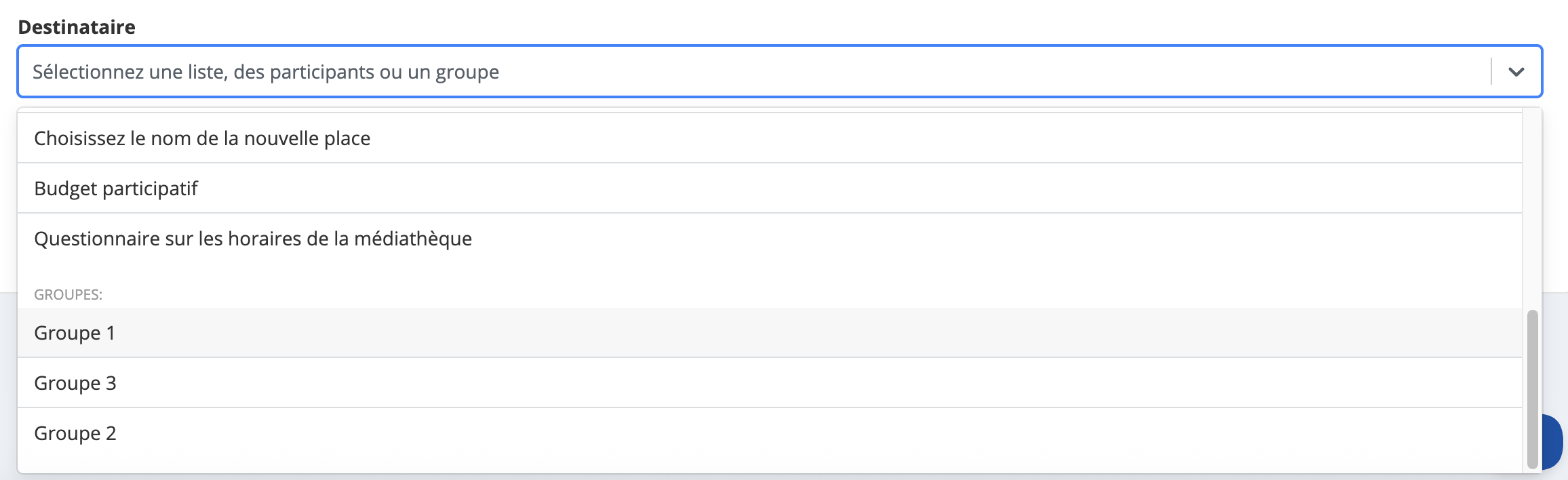 Lorsque vous créez un groupe, cela ajoute automatiquement une liste de diffusion comprenant les membres du groupe dans l'outil d'emailing. Cette liste peut être sélectionnée comme Destinataire dans une campagne (Emailing > Liste des campagnes).