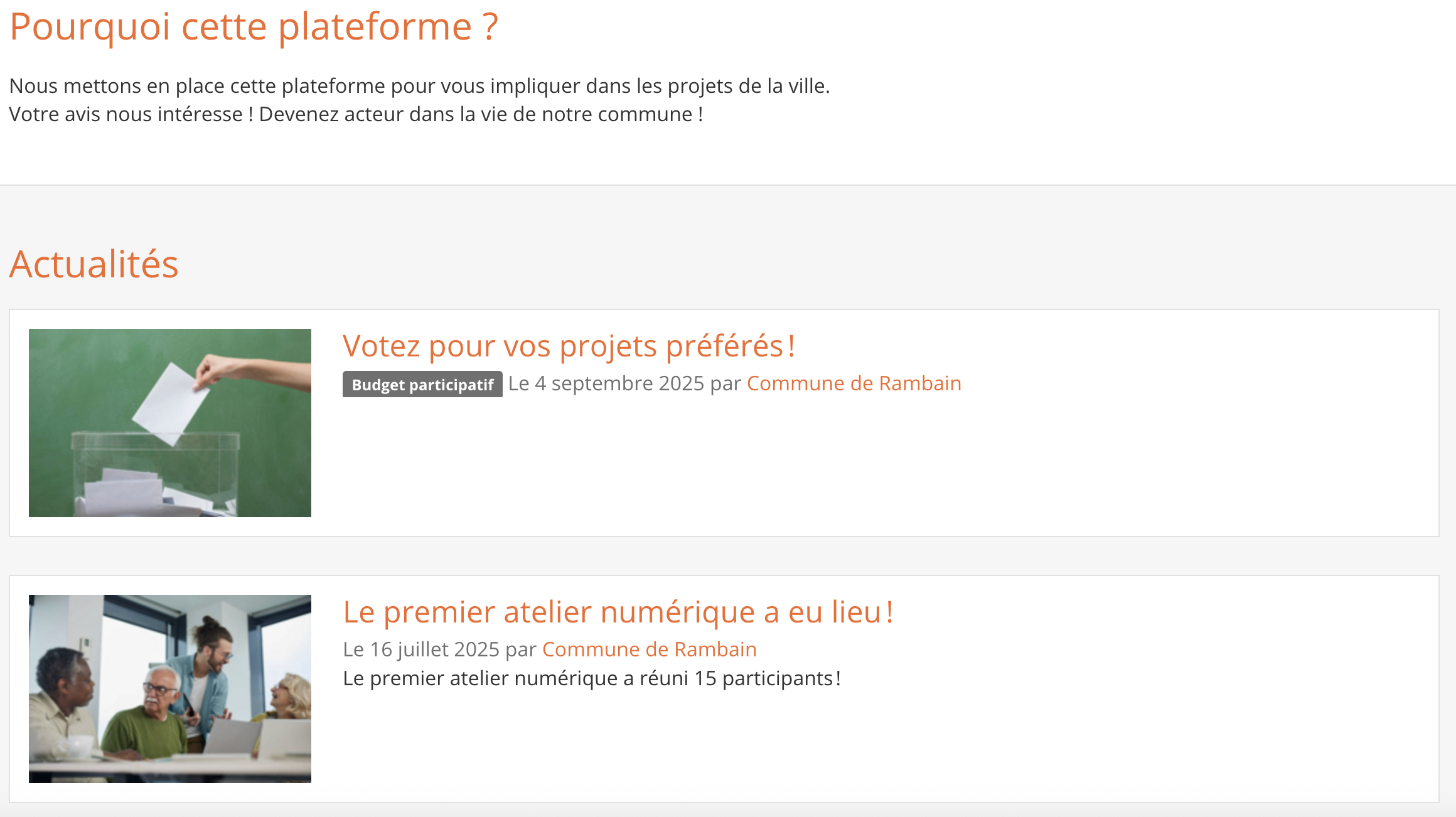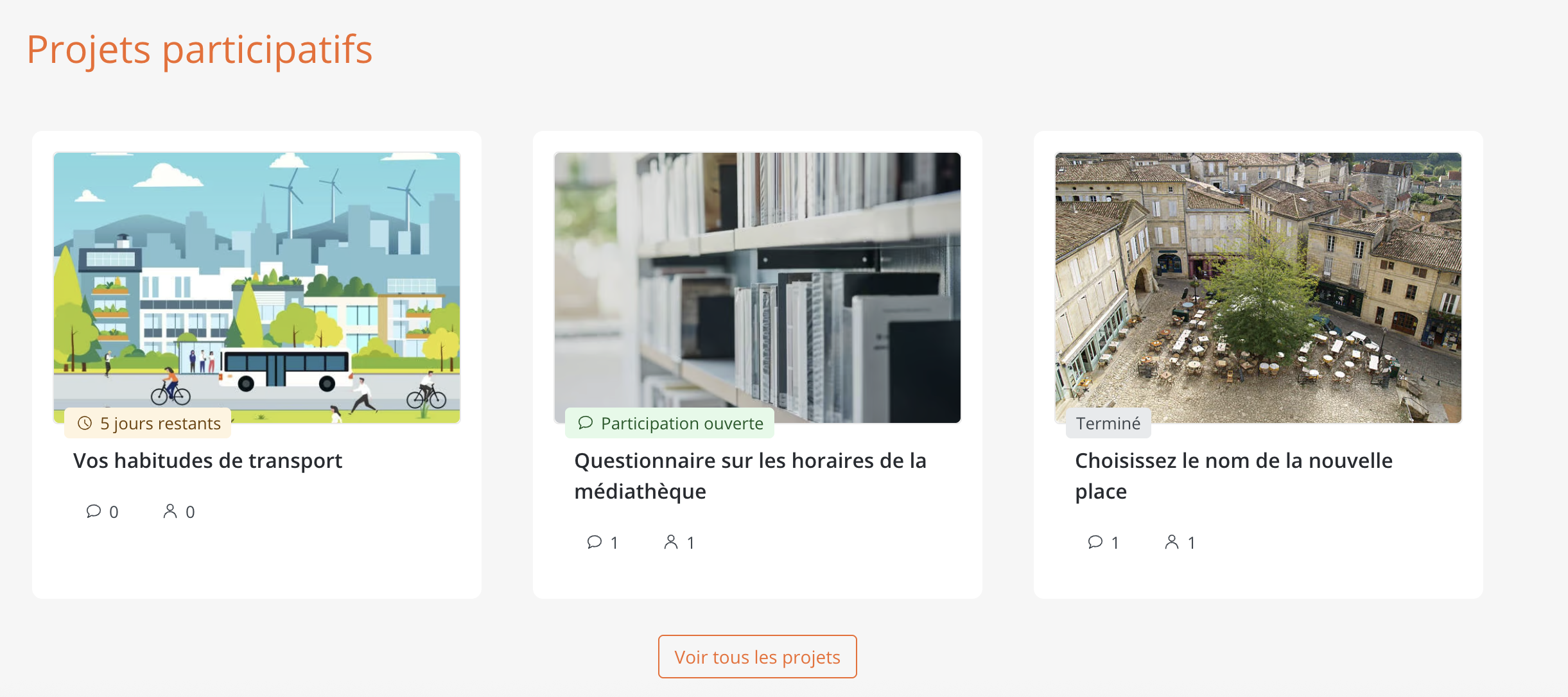 Les vignettes de vos projets participatifs seront donc affichés dans une section sur l'accueil de cette façon :