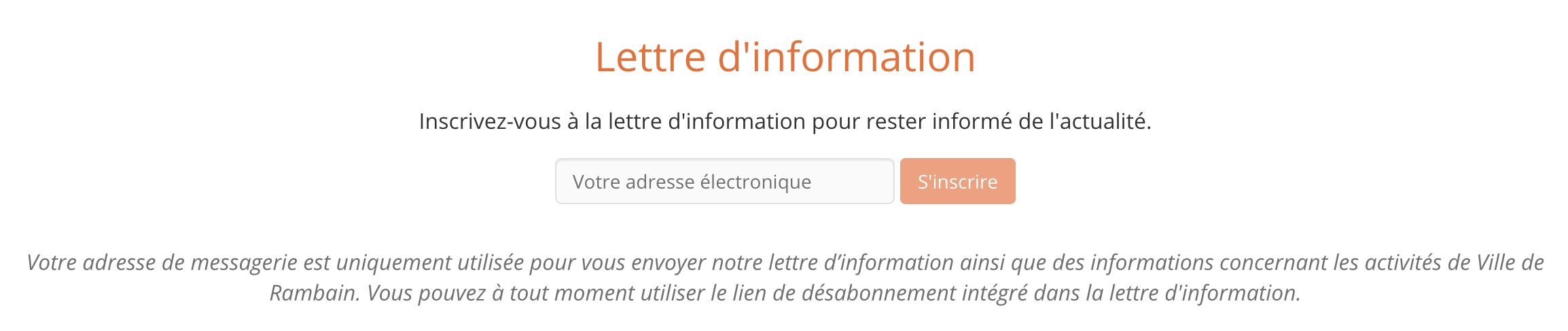 Cette section permet de recueillir les adresses des utilisateurs souhaitant recevoir une newsletter. Les adresses sont alors disponibles dans le menu Utilisateurs > Inscrits à la lettre d'information.