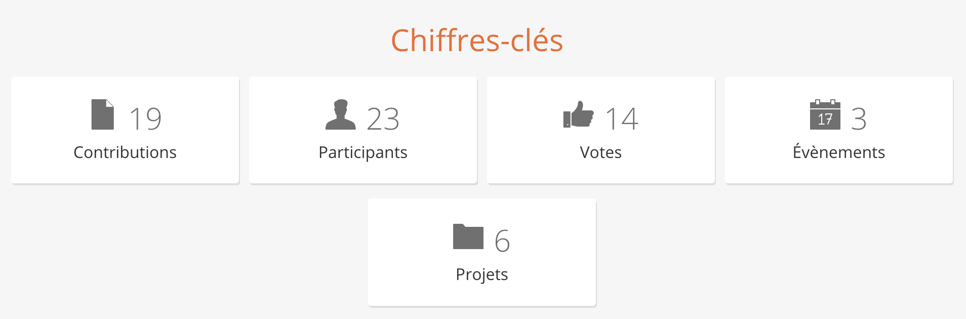 Cette section vous permet d'afficher les chiffres-clés de votre plateforme. Il s'agit de compteurs globaux qui se mettent à jour en temps réel. Vous pouvez afficher le nombre d'événements, de projets et de contributions/participants/votes.