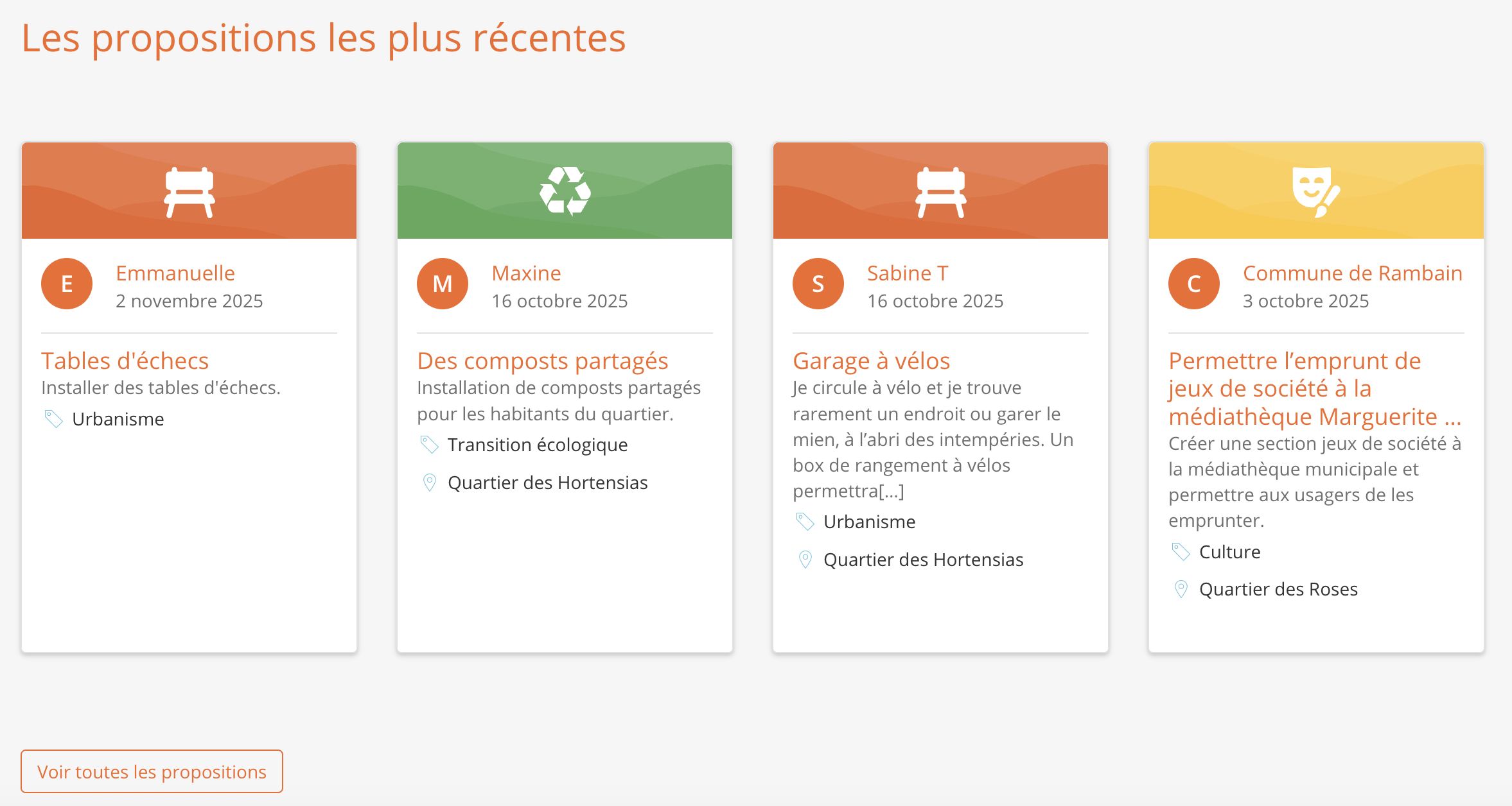 Cette étape permet d'afficher les propositions les plus récentes d'une étape de dépôt (budget participatif, appel à projets, projet d'entraide, pétitions).
