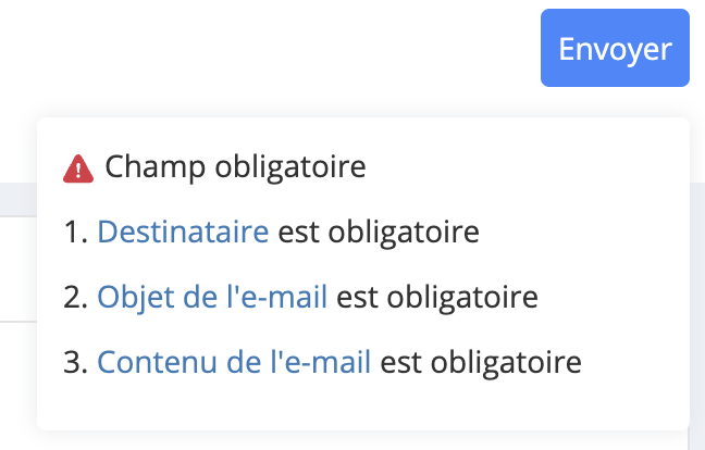 Si vous n'avez pas sélectionné une liste de diffusion ou un groupe et/ou si vous n'avez pas rempli les champs Objet de l'email et Contenu de l'email, cela vous sera indiqué sous le bouton Envoyer. Sur l'exemple ci-dessus, Destinataire, Objet de l'email et Contenu de l'email sont des liens : en cliquant dessus, vous êtes redirigé vers l'onglet concerné pour effectuer les modifications.