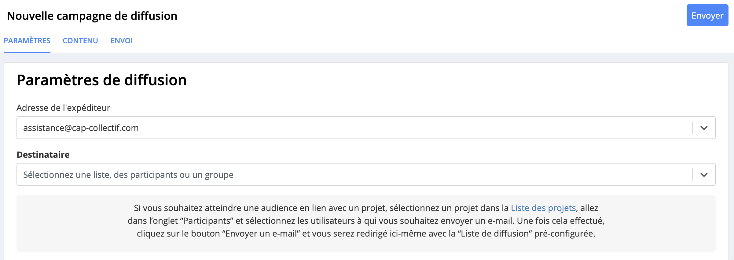 Le message ci-dessus, affiché dans le bas de l'onglet Paramètres, vous explique comment créer une liste de diffusion composée de participants à un projet participatif. Le lien " Liste des projets" vous redirige vers le menu Projets participatifs > Tous les projets.
