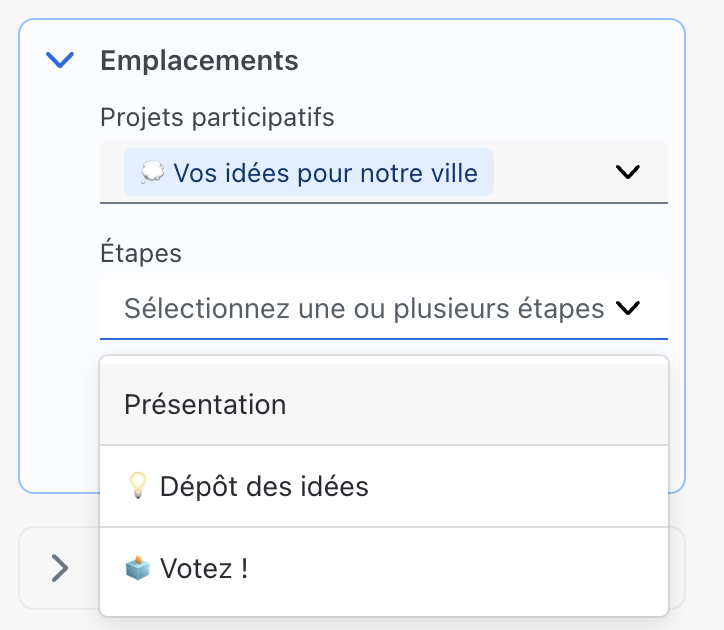 Les champs "Projets participatifs" et "Étapes" vous permettent de choisir exactement où votre événement apparaîtra. Vous devez sélectionner au moins un projet participatif dans la liste pour voir le champ Étapes s'afficher. La sélection d'un projet participatif est obligatoire.