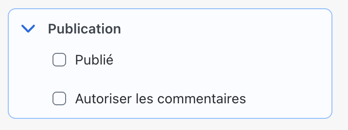 Dans l'encart Publication, la case "Autoriser les commentaires" ouvre les commentaires aux utilisateurs du site.