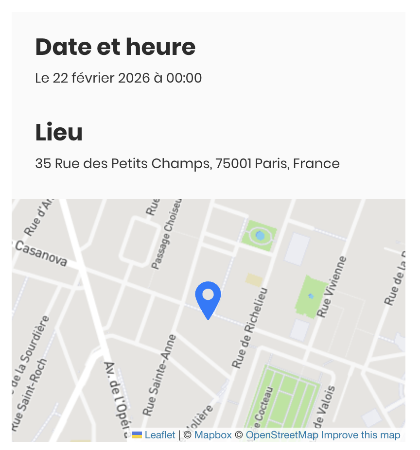 Le champ Lieu ou adresse permet l'affichage de l'événement sur la carte dans sa page.