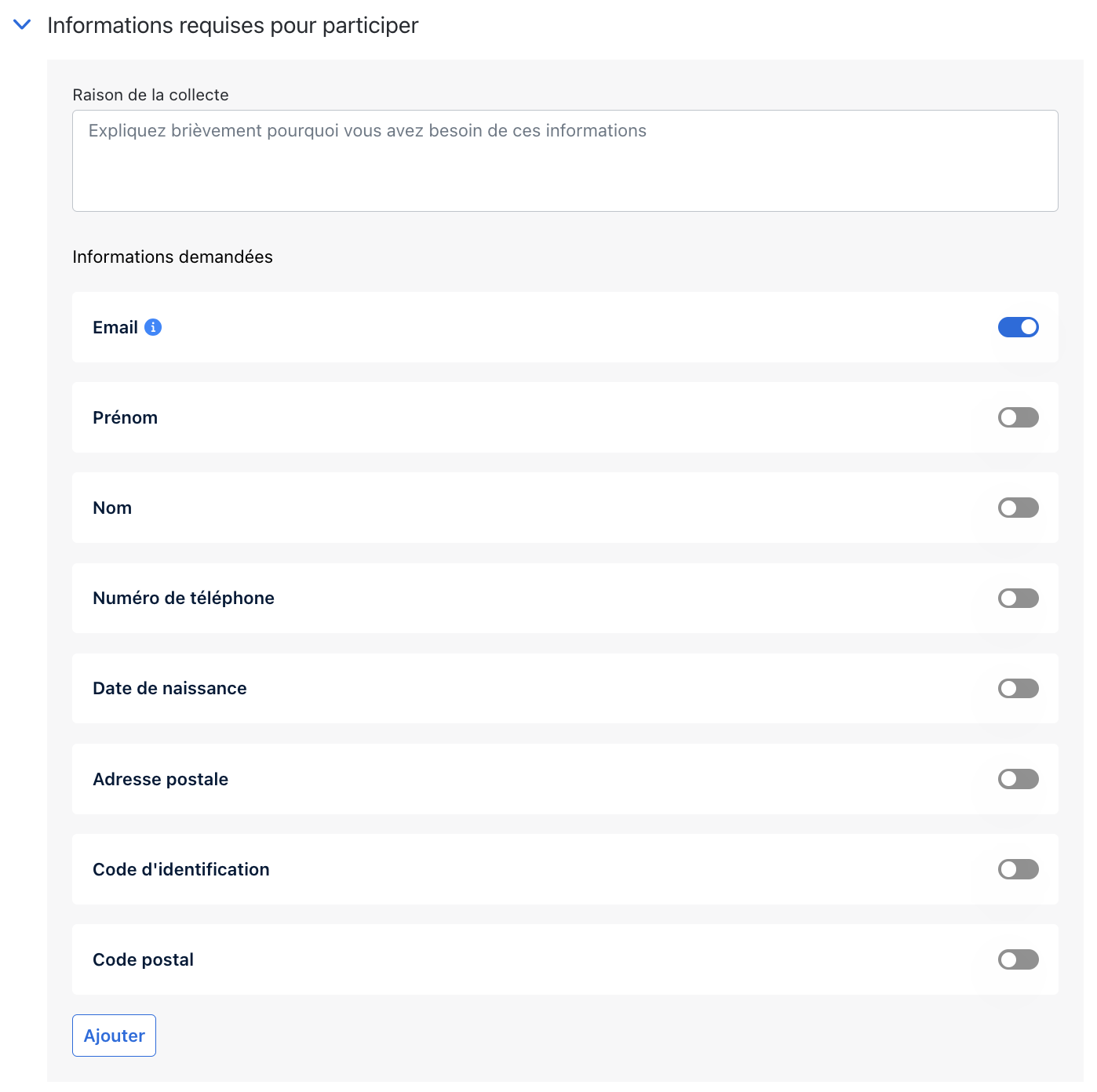 La liste des informations requises pour participer (anciennement "conditions requises") a été mise à jour et enrichie de 2 conditions supplémentaires : l'email et le code postal.