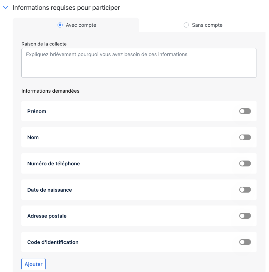 L'administrateur n'a plus le choix entre participation avec ou sans compte car on participe sans compte par défaut et l'administrateur peut donc demander les informations requises qu'il souhaite (si la donnée est nécessaire au traitement des réponses, par souci de sécurisation de la participation, etc). Attention à ne pas demander d'informations non essentielles, au risque de freiner la participation.