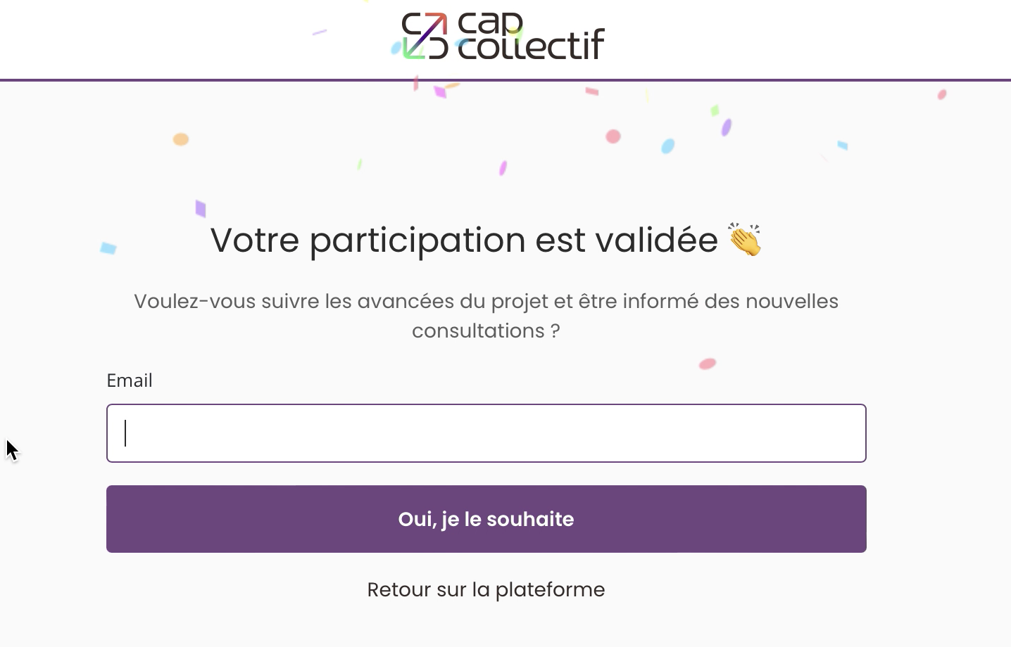 - La participation se fait sans compte par défaut. On ne force pas le participant à se créer un compte. Il se crée un compte sur la plateforme s'il le souhaite.