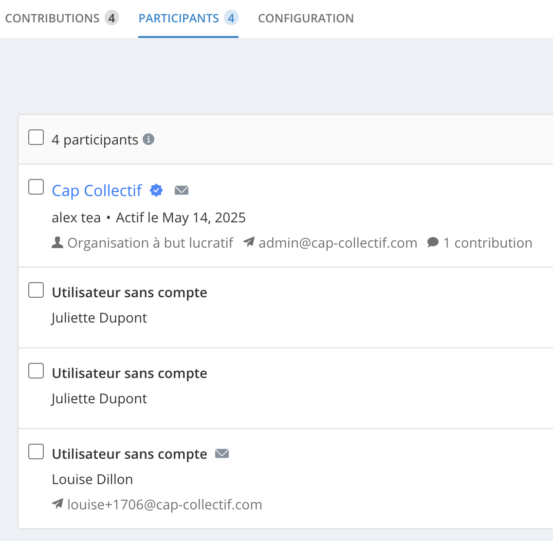 Dans l'onglet Participants de votre projet, vous retrouverez maintenant les participants avec et sans compte :