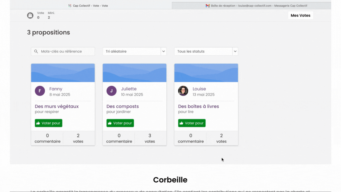 - Si un utilisateur participe avec un compte puis en sans compte avec la même adresse mail, il est connecté automatiquement et ses votes sont réconciliés si les modalités de vote sont respectées (minimum atteint et pas de dépassement du vote maximum).