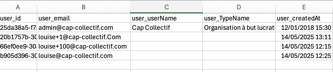 Dans l'export des contributions et des participants, vous retrouverez également les participants sans compte (il n'y a pas de nom d'utilisateur pour les participants sans compte mais leur adresse mail et autre informations collectées se retrouvent dans l'export).