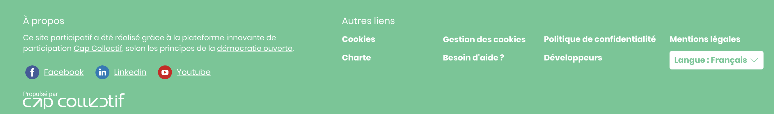 Le pied de page contient un titre, un texte personnalisé (champ Contenu) et des liens vers les réseaux sociaux (ils se configurent dans le menu Réglages > Réseaux sociaux (pied de page) ainsi qu'un menu de navigation (voir l'article Modifier la barre de navigation).