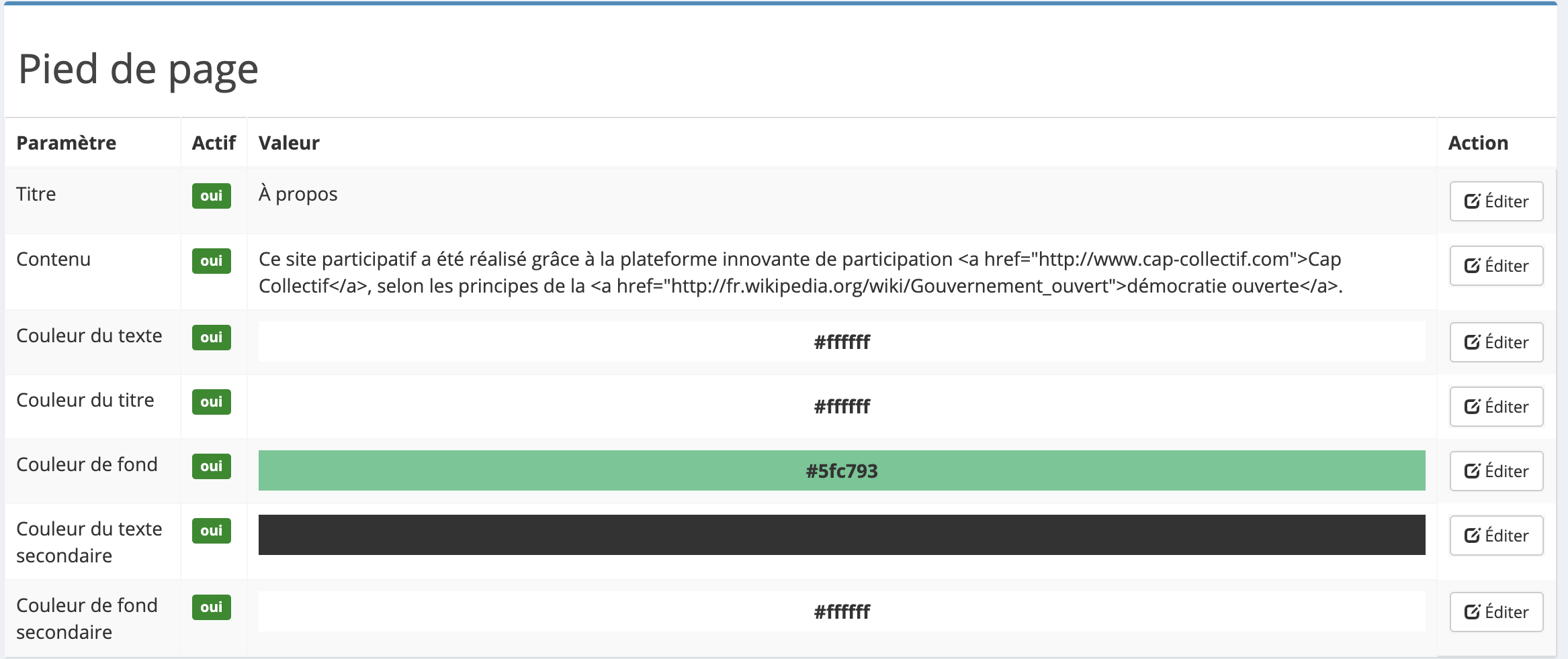 Le menu Pages > Pied de page permet de modifier le contenu et les couleurs du pied de page.